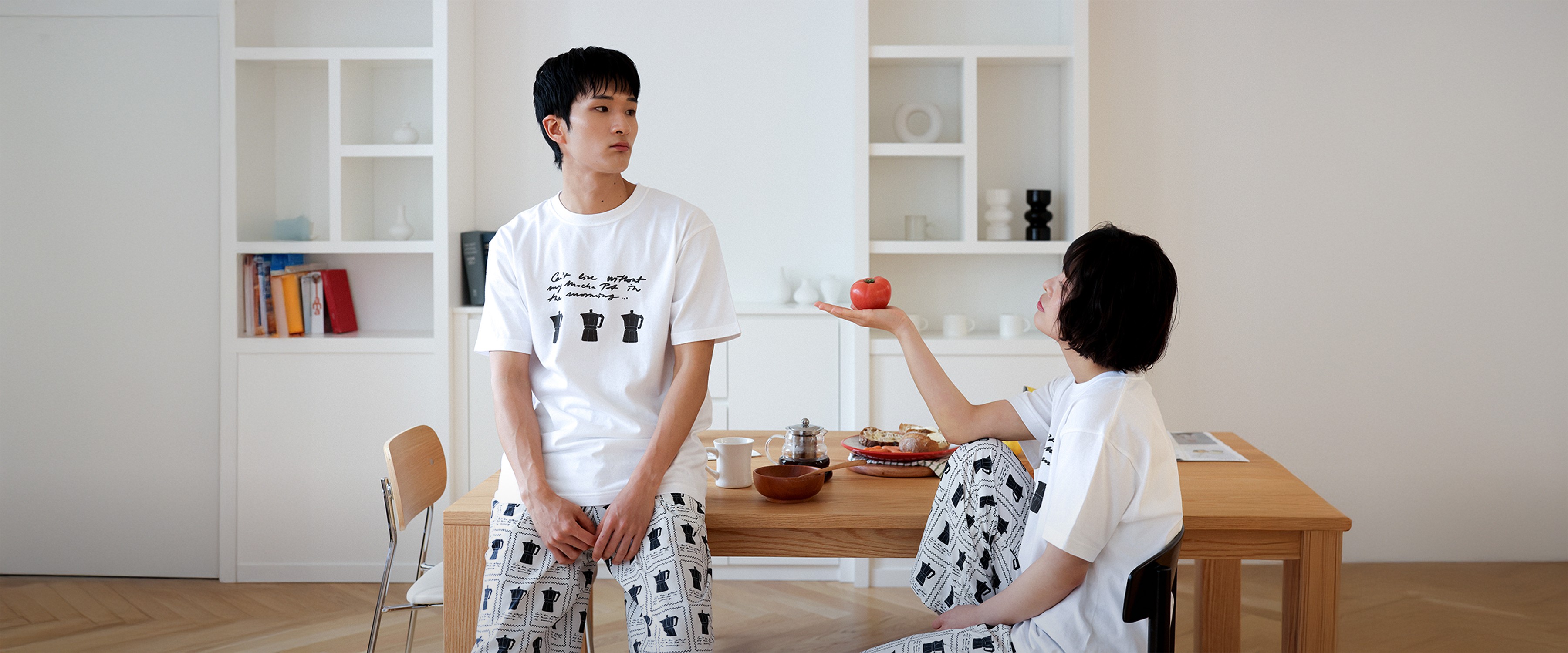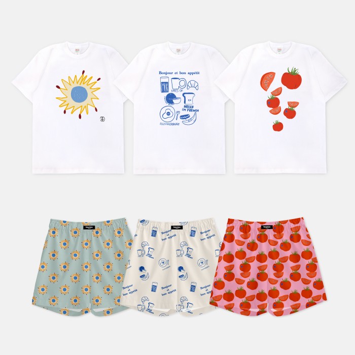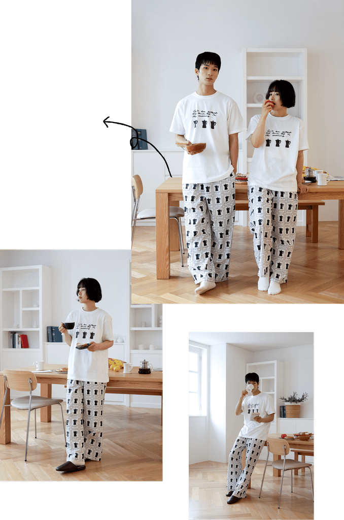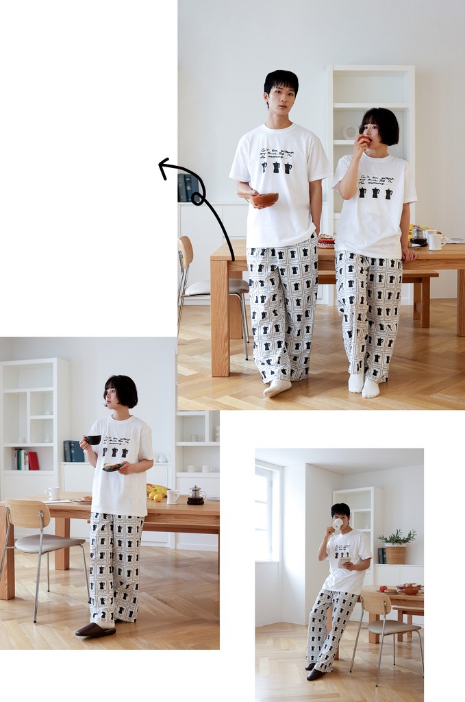 침대에 누워 있을 때도, 잠깐 밖에 나갈 때도 어색하지 않은 옷이면 좋겠다고 생각했어요. 부드러운 순면 위에 감각적인 드로잉을 담은 5가지 디자인, 3가지 타입의 파자마.