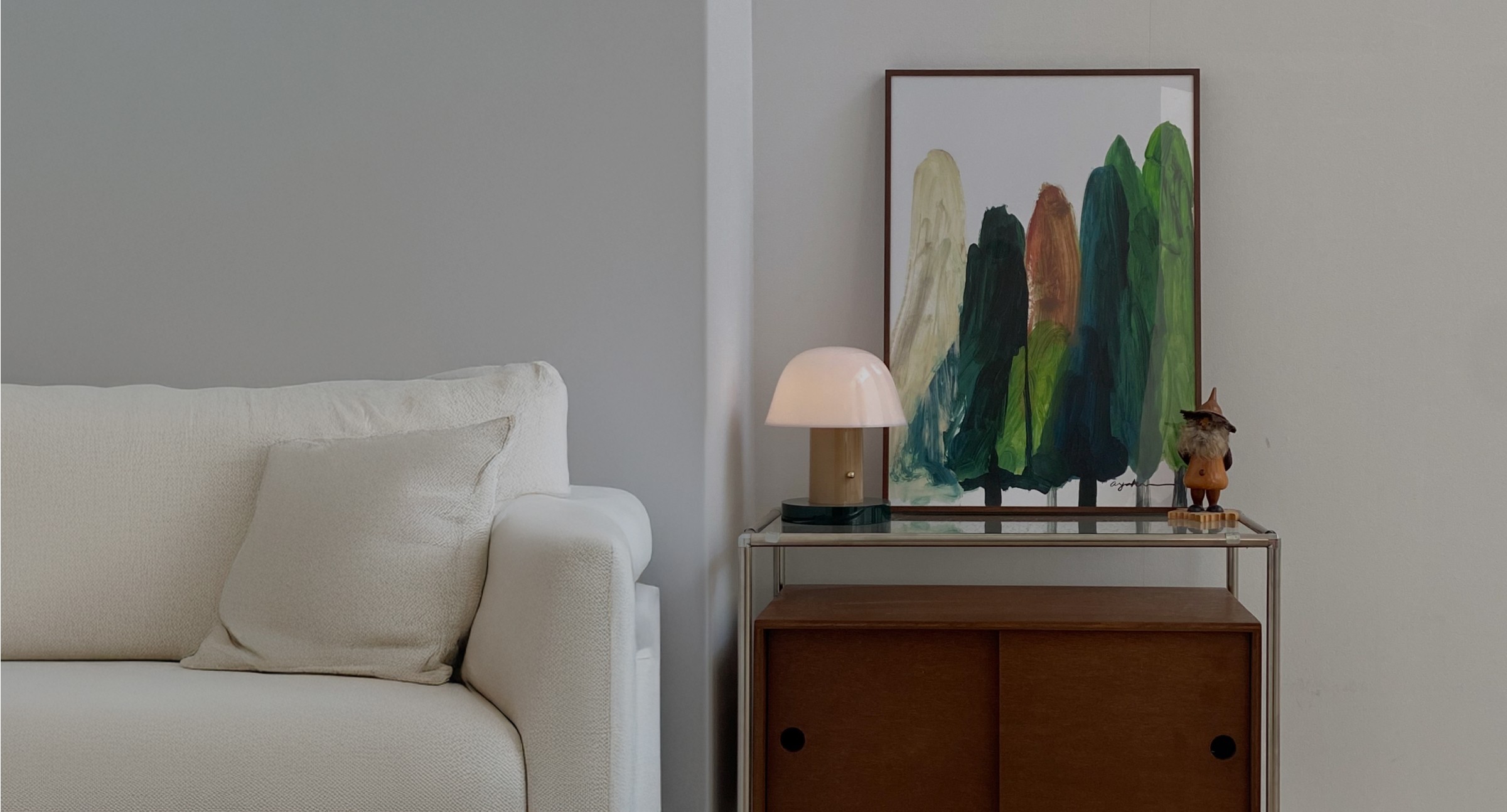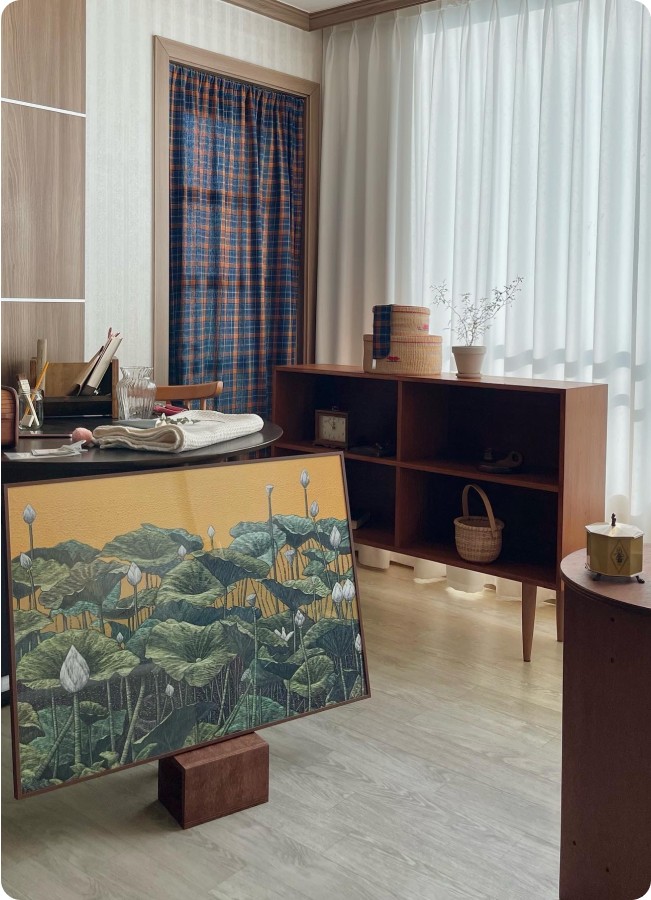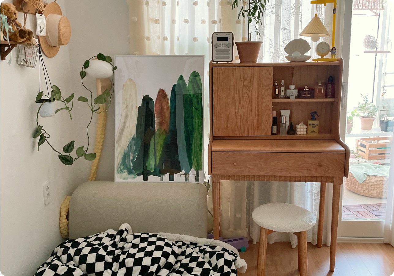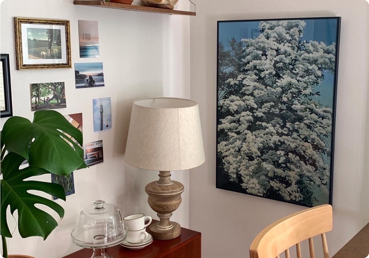 햇살이 머무는 벽 한쪽, 작은 가구와 따뜻한 조명이 어우러진 공간. 그 안에서 가장 눈길을 끄는 건 바로 커다란 나무가 담긴 액자.