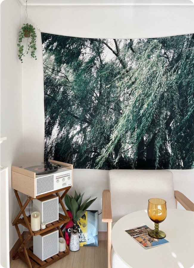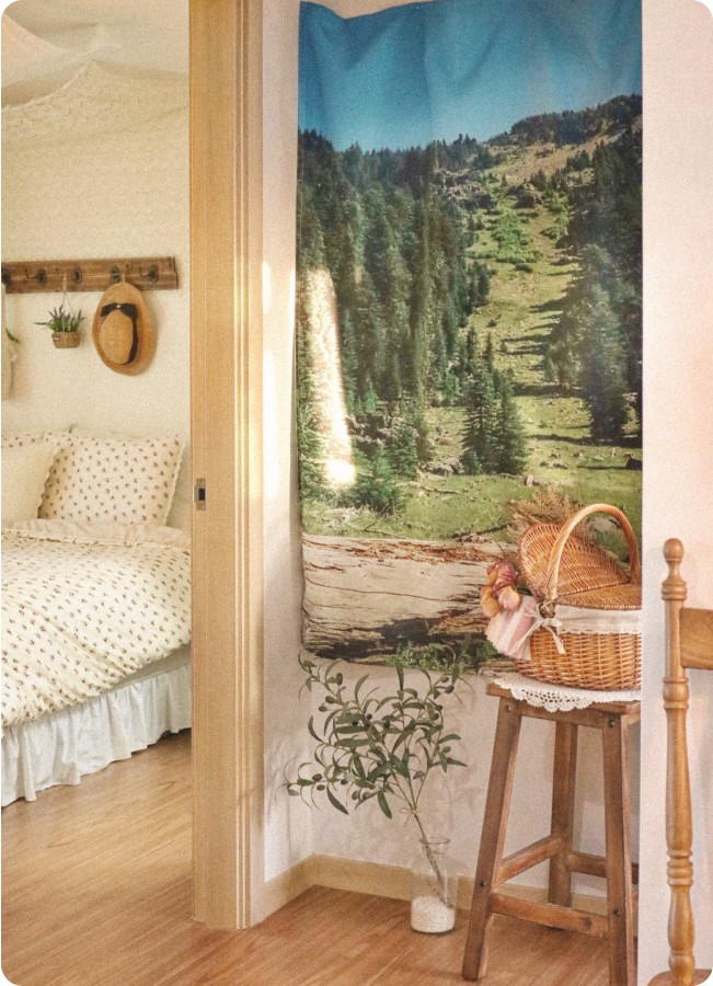 혹은, 커튼 대신 푸른 숲이 담긴 패브릭 포스터를 걸어보는 건 어떨까요? 실제 나뭇잎이 흔들리진 않지만, 가벼운 천이 바람에 살랑이는 것만으로도 자연의 온기가 전해질 거예요.