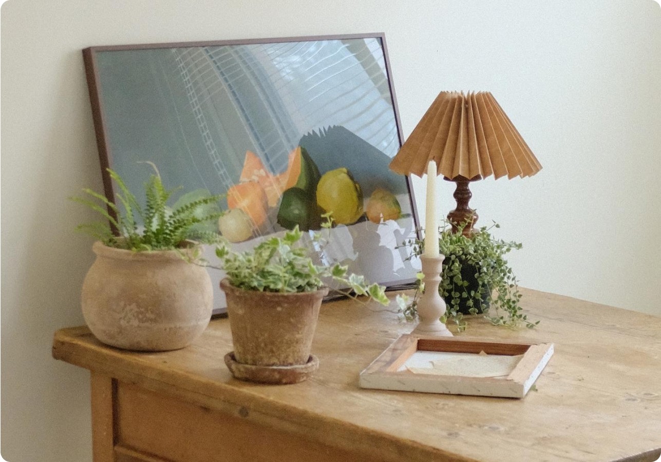 오래된 원목 테이블 위, 기대어진 과일 정물화. 그림 하나만으로도 공간에 따뜻한 온기가 감돌아요. 꼭 실제 식물을 키우지 않더라도, 자연을 닮은 오브제를 활용하면 그 분위기를 충분히 즐길 수 있어요.