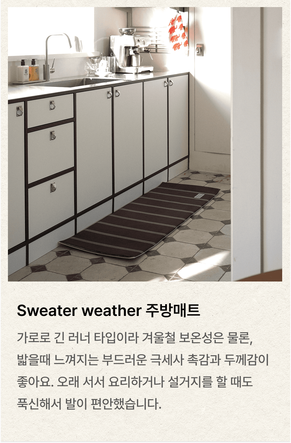 아이보리–브라운이라는 안정적인 베이스 위에 텍스처의