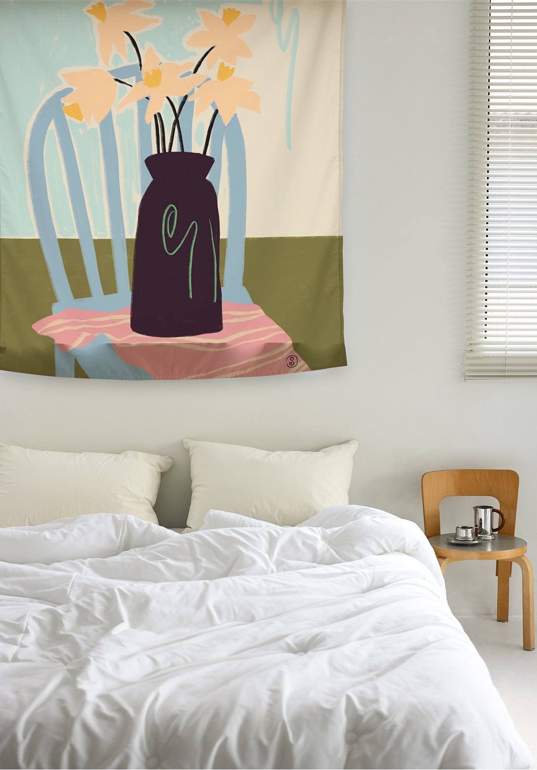 햇살에 부드럽게 물든 침실, 스며든 꽃 한 송이.
