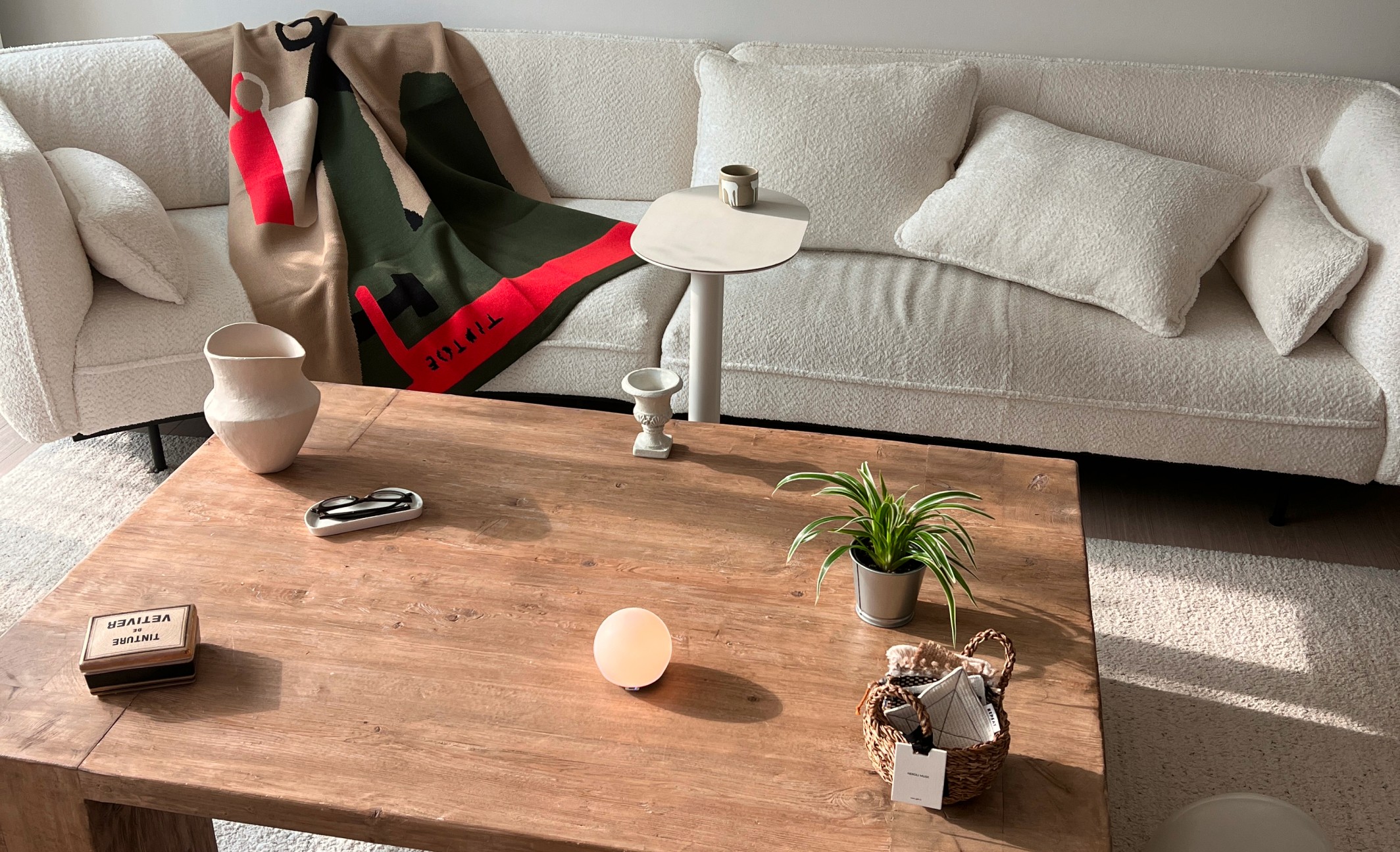 뉴트럴 톤이 단조로워 보이지 않도록 텍스처와 포인트 컬러로 균형을 잡았어요.